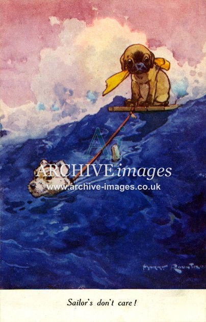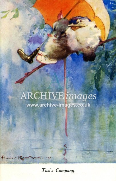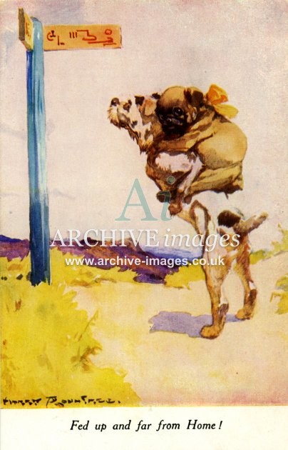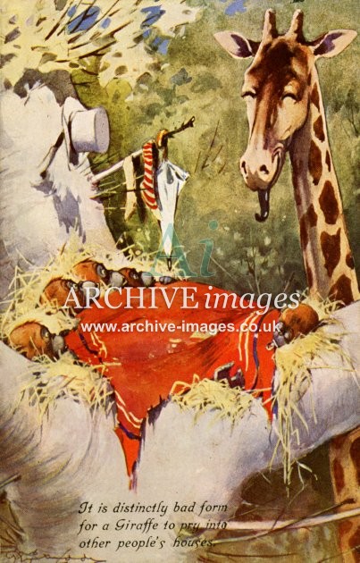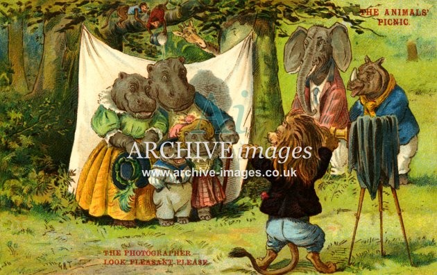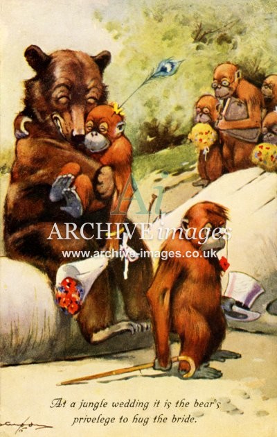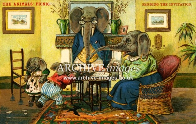 Archive artistic images of Anthropomorphic Animals. Beginning in the Victorian era, anthropomorphic art – the art of animals in human form and situations – became very popular and remains so today. Here we see all manner of animals depicted in human dress and carrying out human tasks. Cats and then dogs were the most popular but many other animal species, including pigs, elephants, monkeys, lions, chickens, rabbits, squirrels, birds and insects have all found themselves caricatured in human form and some stage. The most famous of the artists in this genre was undoubtedly Louis Wain but there were many other well known names during the first half of the 20th century, including Arthur Thielé, Maurice Boulanger, GE Studdy, Harry Rountree and WR Ellam.
