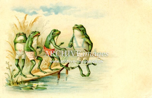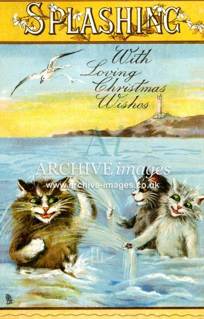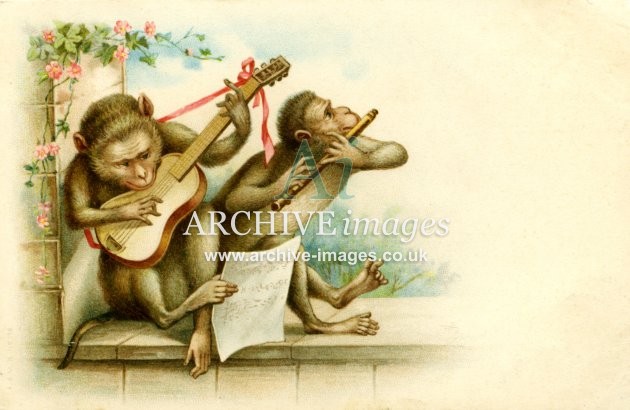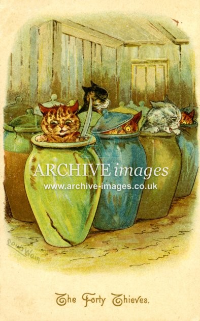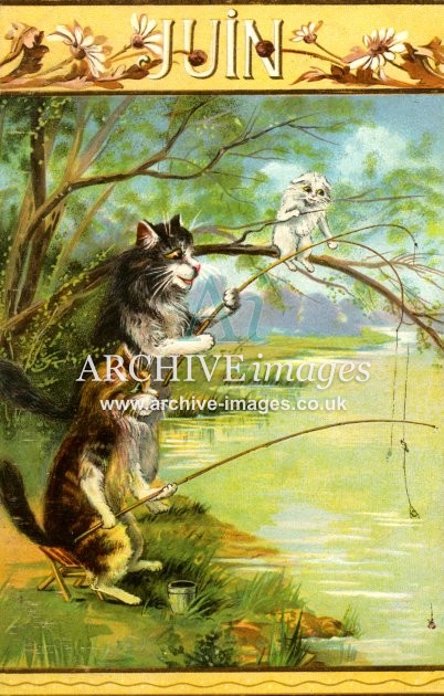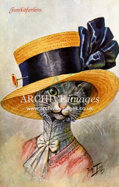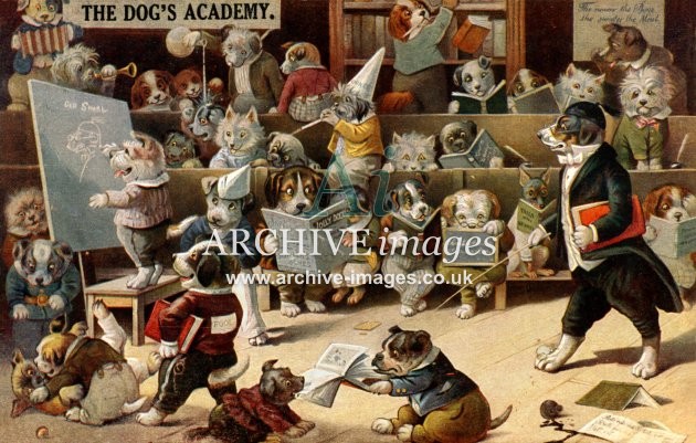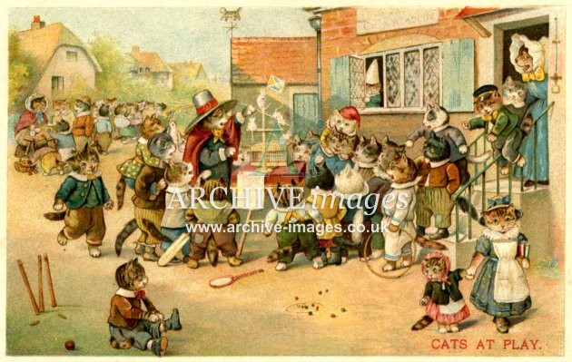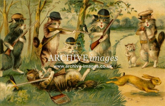 Archive artistic images of Anthropomorphic Animals. Beginning in the Victorian era, anthropomorphic art – the art of animals in human form and situations – became very popular and remains so today. Here we see all manner of animals depicted in human dress and carrying out human tasks. Cats and then dogs were the most popular but many other animal species, including pigs, elephants, monkeys, lions, chickens, rabbits, squirrels, birds and insects have all found themselves caricatured in human form and some stage. The most famous of the artists in this genre was undoubtedly Louis Wain but there were many other well known names during the first half of the 20th century, including Arthur Thielé, Maurice Boulanger, GE Studdy, Harry Rountree and WR Ellam.