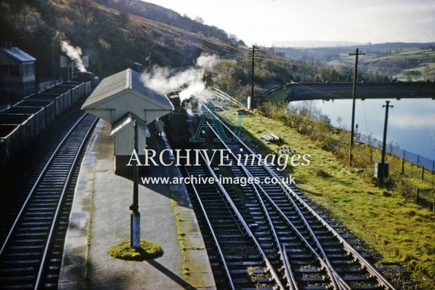 Pannier tank No. 6416 with a passenger service at Pontsticill on 9th November 1961. Coal empties on the left.