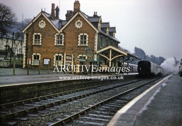 The 12.10pm to Newport waits to leave Brecon on 27th Jan 1962