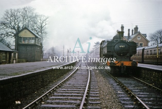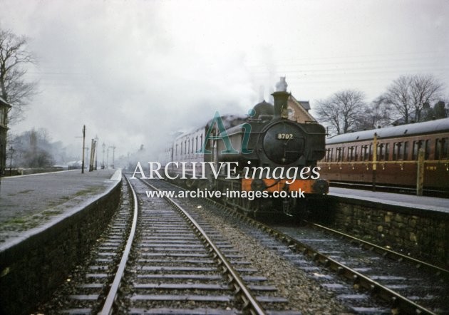 Ex-GWR 57xx 0-6-0PT No 8702 with the 12.10pm to Newport at Brecon on 27th Jan 1962