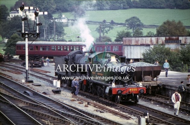 Newly refurbished 45xx Class tank No. 4555, turned out in full GWR livery, taking water at Totnes prior to its delivery to the Dart Valley Railway on 2nd October 1965