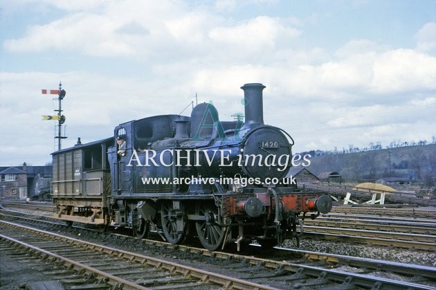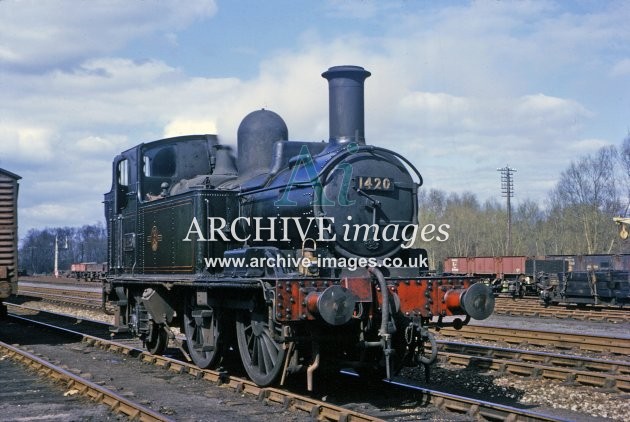 14xx 0-4-2T No. 1420 and GWR Toad brake van pose in Leominster Yard in April 1964