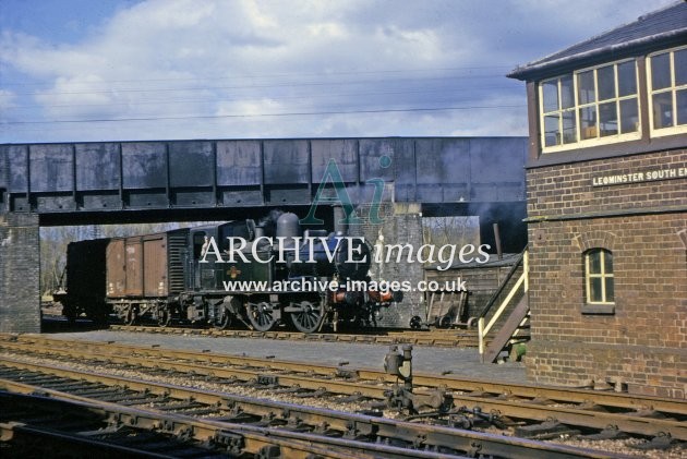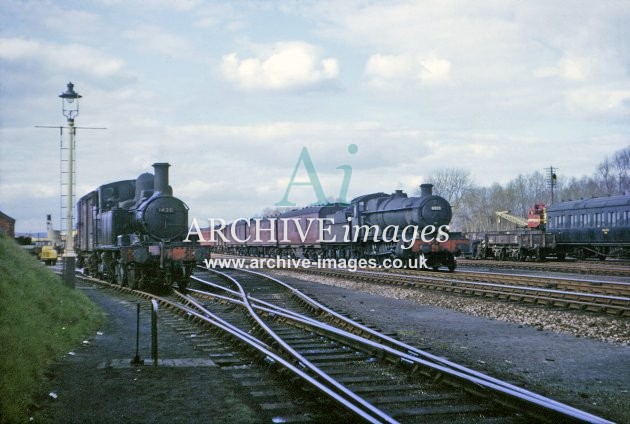 Ex-GWR 4-6-0 No. 6838 Goodmoor Grange heads north at Leominster South End in April 1964, as No. 1420 shunts the yard.