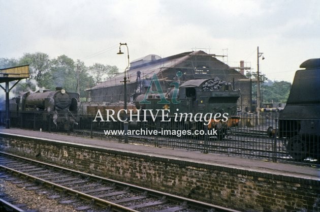 An ex-GWR 45xx Prairie tank on shunting duties at Yeovil Junction in August 1962, with the engine shed undergoing some repair work in the background