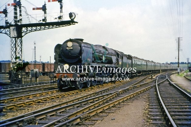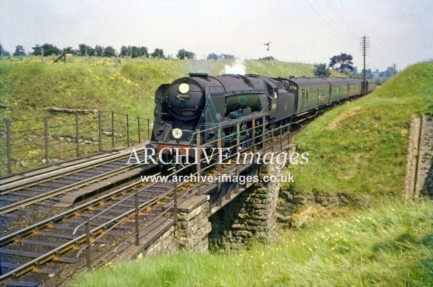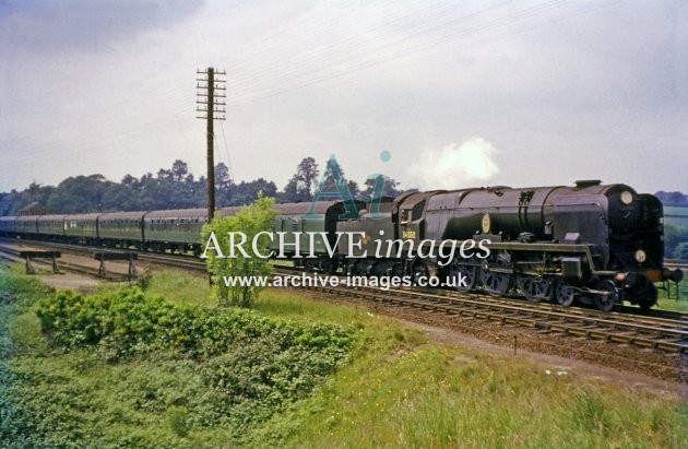 West Country Class 4-6-2 No. 34093 Saunton approaching Yeovil Junction in June 1961 with an express for Exeter Central. The train is just about to pass over the ex-GWR line from Yeovil Pen Mill to Weymouth