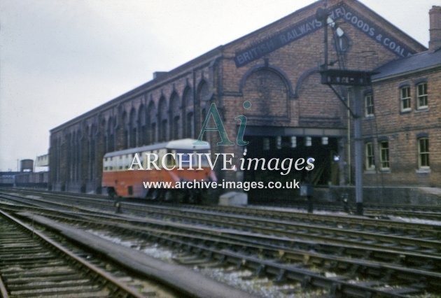 A WR railcar on a service from either Woofferton or the Severn Valley line passes Kidderminster Goods Shed circa 1961