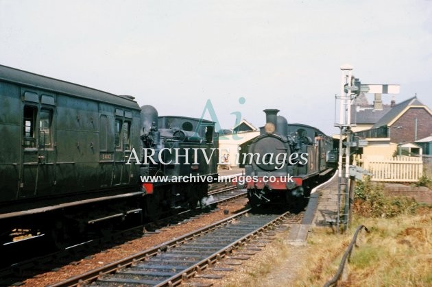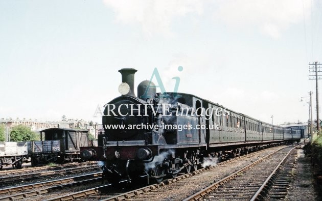 An unidentified O2 Class loco reverses its train out of Cowes station prior to running round the carriages for departure back to Newport in August 1964