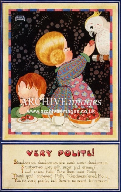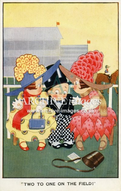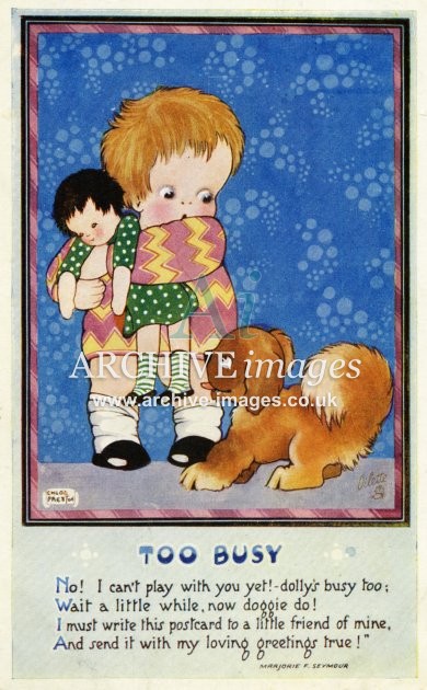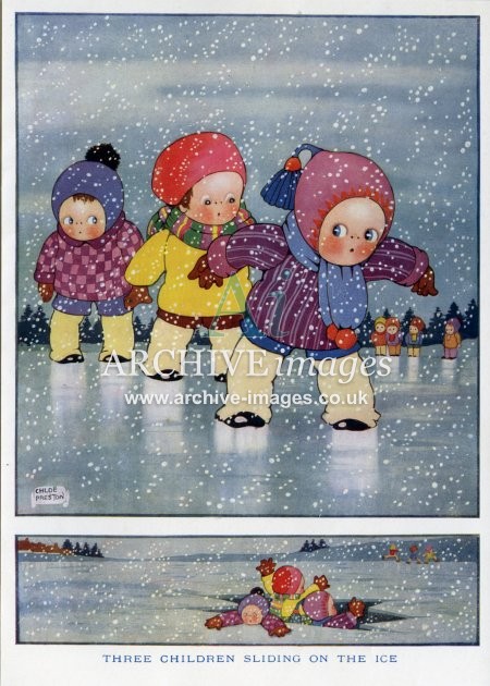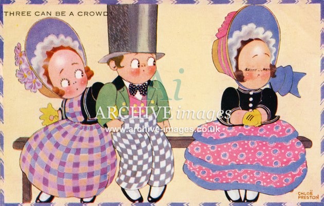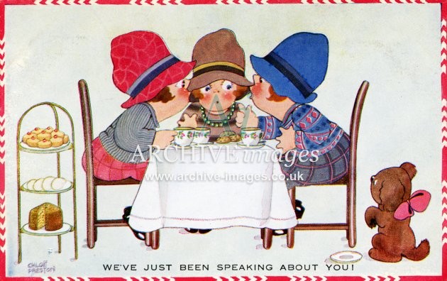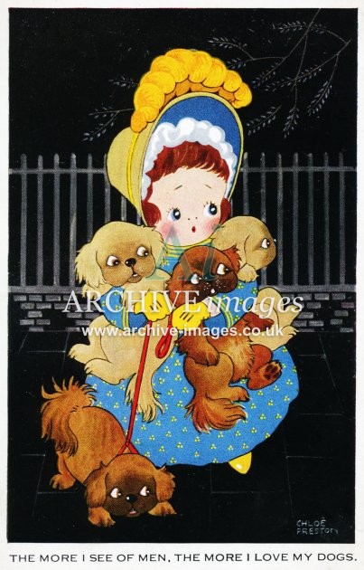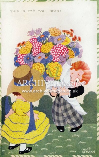 Images by the children's artist Chloe Preston, whose work appeared on postcards in the late 1920s and 1930s. Specialising in cute, snub-nosed children in adult guise and situations, often illustrating an alternative take on well known phrases or fashions of the period. Working in the then fasionable art deco style, Chloe Preston's work is amusing, bright and attractive.