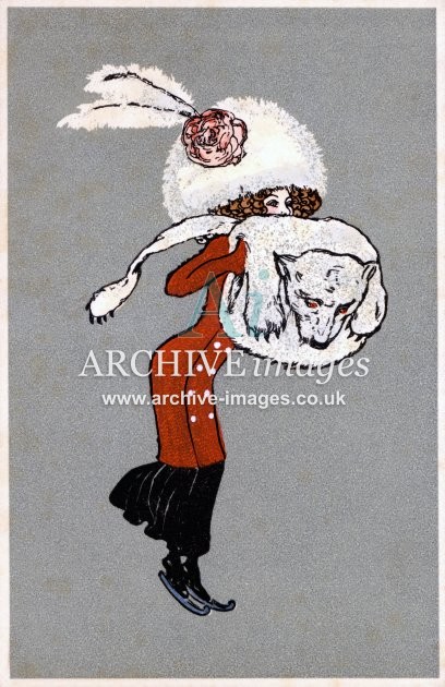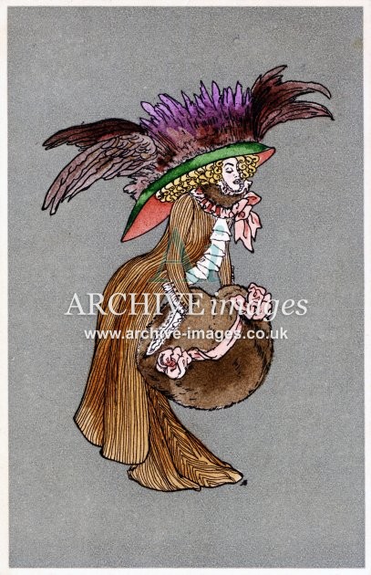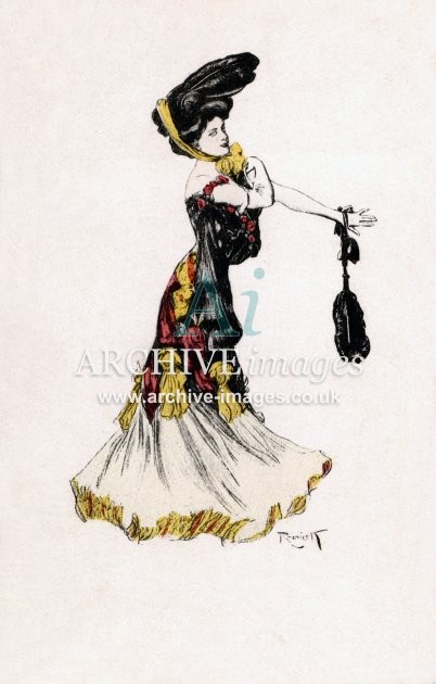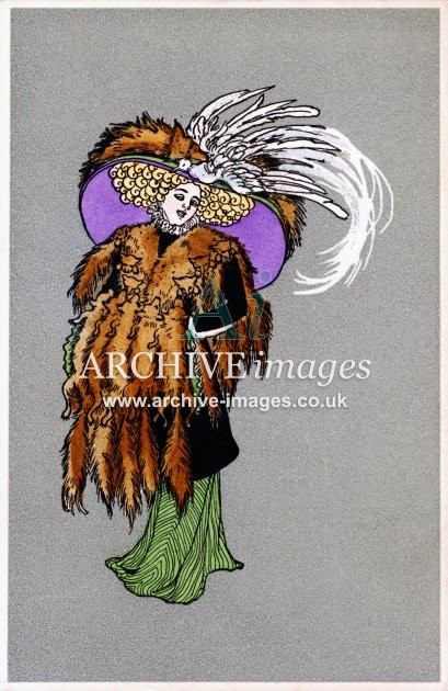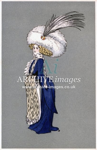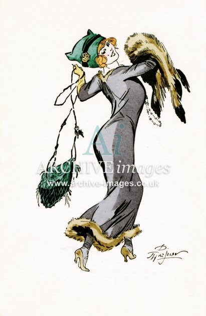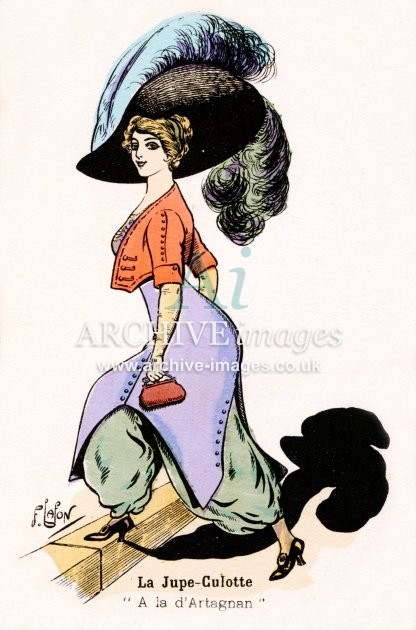Artistic images from the early 20th century of French, particularly Parisienne, Ladies Fashions, mainly from original old postcards, featuring outlandish new designs such as culottes, pyjama suits, ankle boots, short skirts, trousers and shorts, men's style jackets and some fabulous hats.