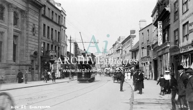 Historic images of the Gloucestershire Spa town of Cheltenham, including the electric tramway and trams, the railway stations, transport, the local industries, schools, post office, pubs & inns, shops and street scenes
