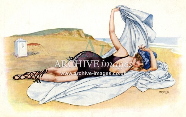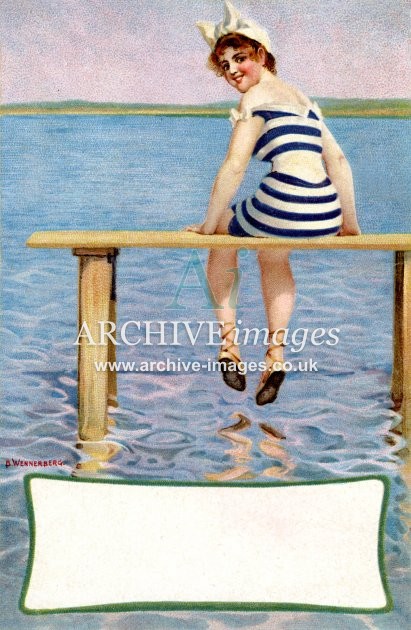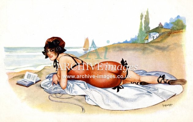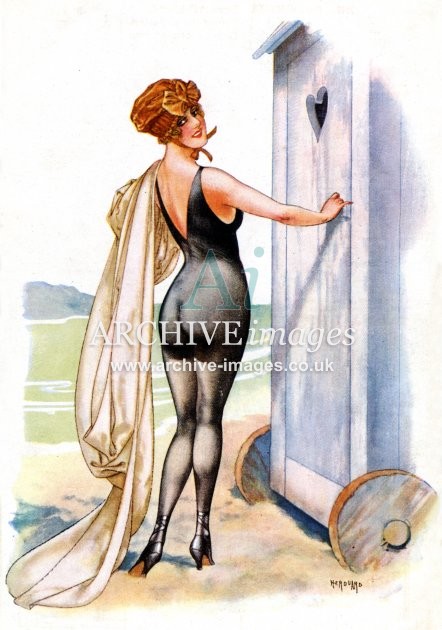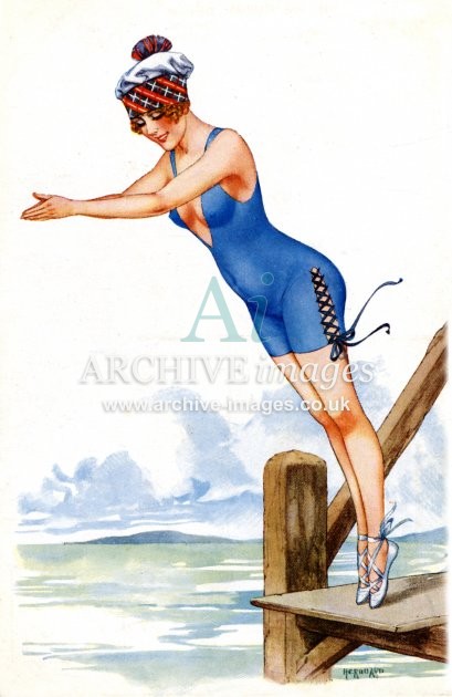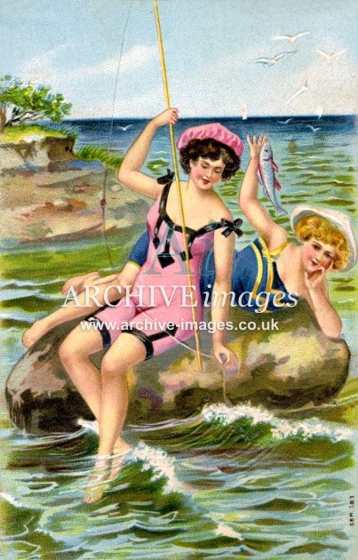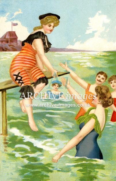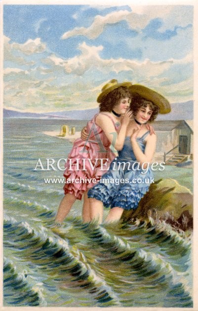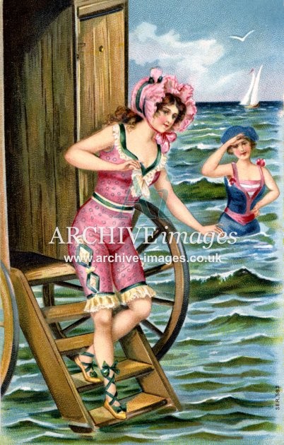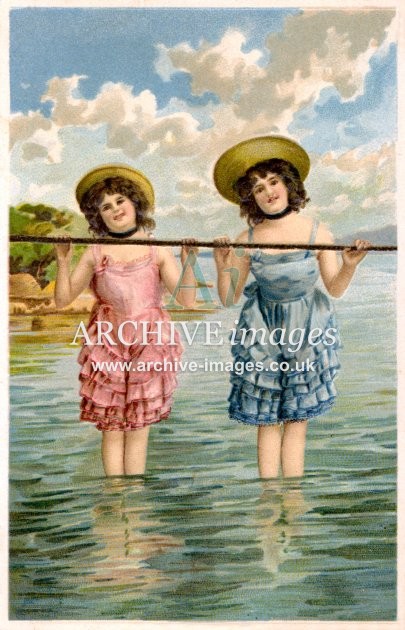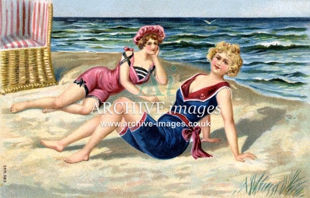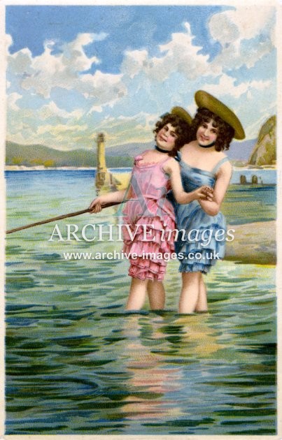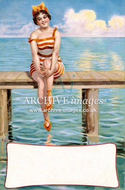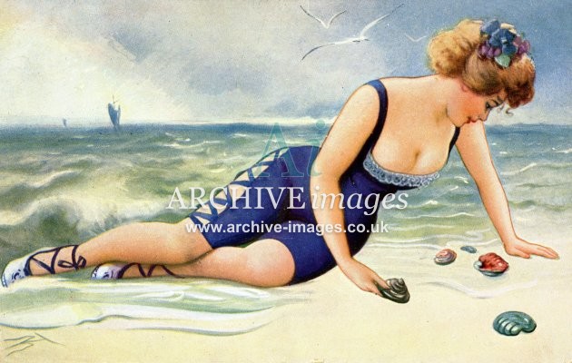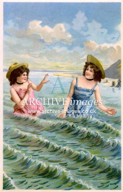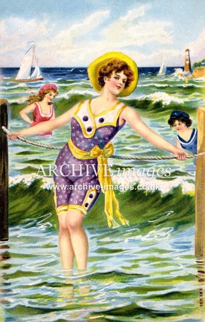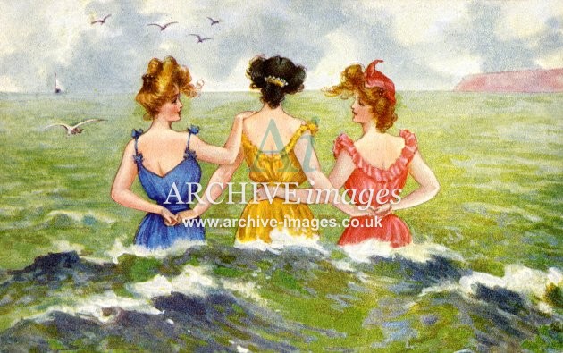 Artistic images from the early 20th century of colourful Bathing Beauties and Beach Belles, mainly from original old postcards