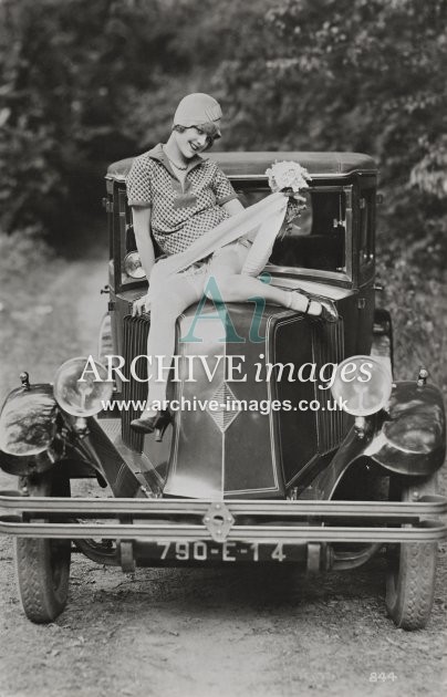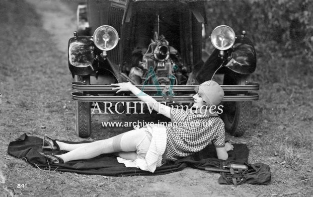 Amusing circa 1925 lingerie study featuring lady attempting to repair motor car