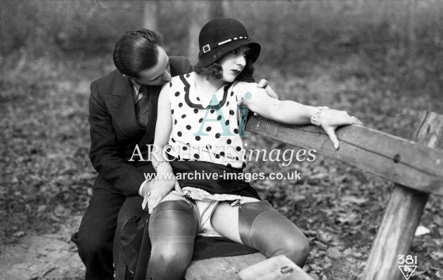 Semi erotic circa 1925 lingerie study featuring male and female on a park bench