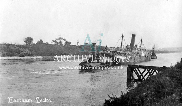 A well laden ship leaves Eastham Locks on the Manchester Ship Canal aided by two tugs circa 1908