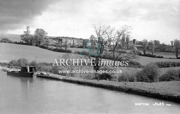 The Oxford Canal at Napton with a maintenance barge moored up circa 1950