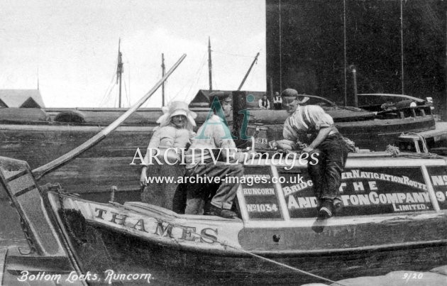 A study of the Anderton Company narrowboat THAMES at Bottom Locks Runcorn, on the Trent & Mersey Canal circa 1908