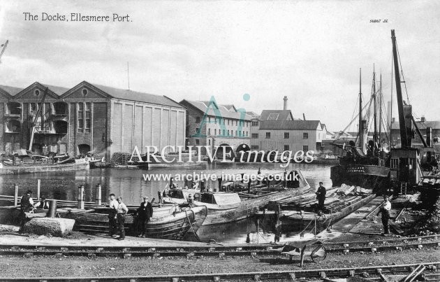 A view of Ellesmere Port circa 1910, with Shropshire Union narrowboats moored in the foreground, a Liverpool registered steam coaster behind and the Telford warehouse in the background