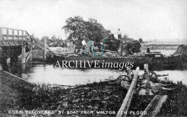 Unloading corn recovered by boat from the flooded Walton Fen, near Ramsey, in 1912