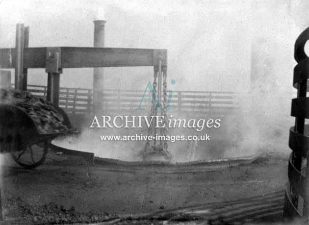 Historic images of British metal works, including iron and steel making, copper works and tin plate works, showing blast furnaces, charging, coke ovens, Bessemer furnaces, metal workers and railway sidings.