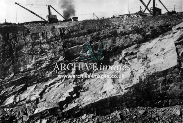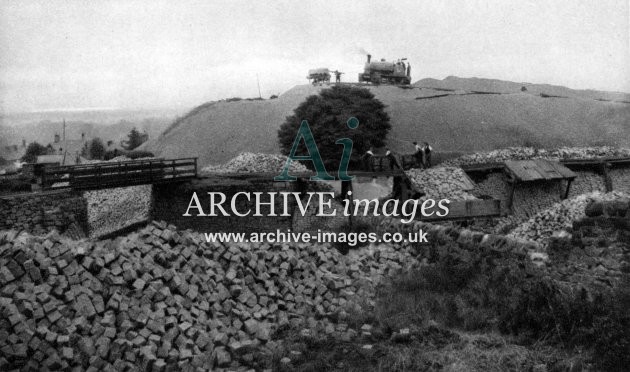 Historic images of the quarrying industry, including stone, granite, limestone, china clay, roadstone, asphalt and slate, showing quarry scenes, stone crushers, stone loaders, railway connections, privately owned railway wagons, quarrymen, slate cutters, stone masons, inclines, tramroads, derricks and stone works