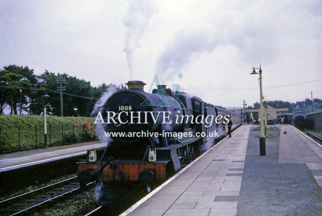 County Class 4-6-0 No. 1008 County of Cardigan pauses at Gwinear Road, junction for the Helston Branch with a Paddington to Penzance express in July 1962. A North British Type 2 diesel sits in the bay on the right with the Helston Branch service