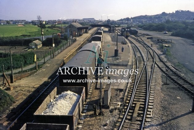 St Blazey station in June 1958, looking south. Public passenger services were withdrawn in 1925, although the station continued in use for workmen's trains until 1934