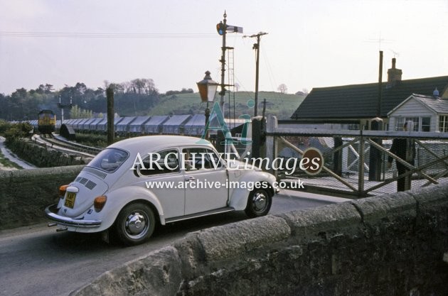 St Blazey crossing closed to traffic as a china clay train is shunted circa 1972. This line leads into Par Harbour. Nice Beetle!