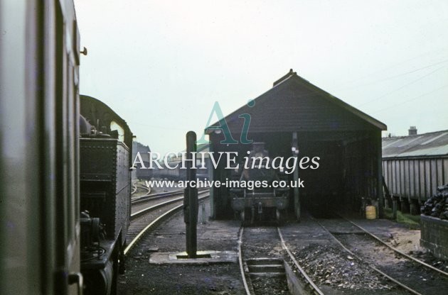 Branch train arriving at Callington, with the engine shed on the right. Photo believed to have been taken in August 1963
